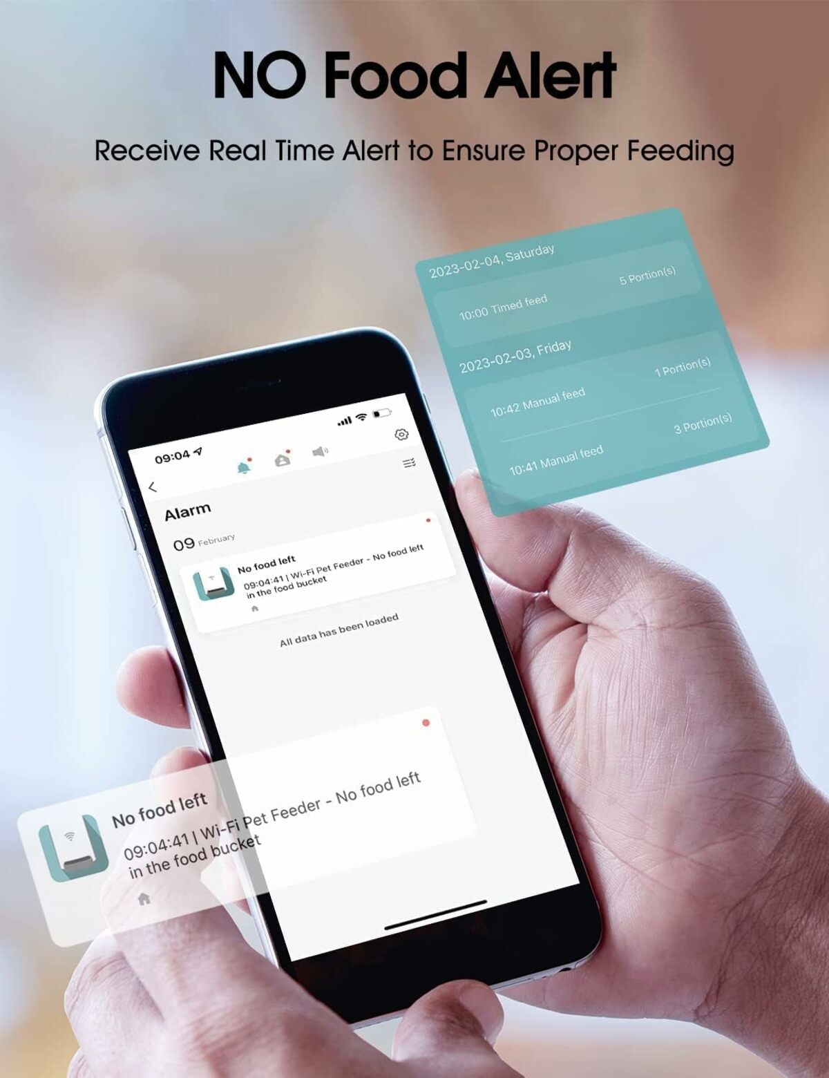 • Alarm function: Will notify you when the feeder is holding less food, no food, or food stuck.